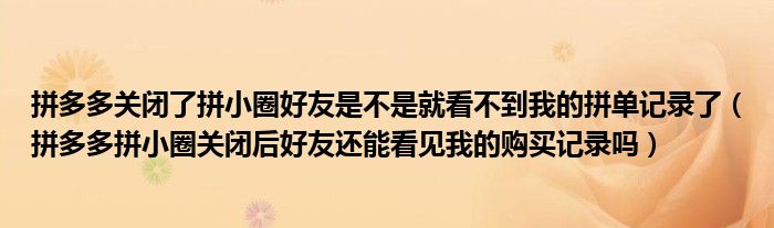 解答:1、拼多多的小圈子关闭后,朋友就看不到自己的购买记录了。小圈子只是给自己和朋友看的,别人看不到。如果买的是私货,动态不会自动同步到小圈子。