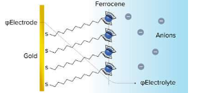 他们通过在电极表面上组装一层氧化还原活性分子来做到这一点。这些长链分子的一端与电极结合,而另一端(含有铁原子的二茂铁头)则暴露于电解质中。通过施加适当的电压使其在中性和带正电状态之间切换,二茂铁单元很容易被氧化和还原。这样的二茂铁单层是探索由电解质中不同种类的阴离子补偿单层电荷所引起的结构和能量变化的理想探针。