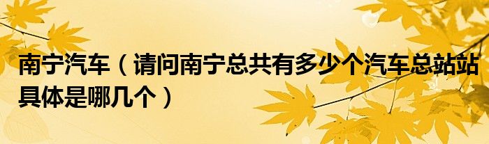 1,请问南宁总共有多少个汽车总站站具体是哪几个:琅东汽车站、江南客运站、安吉客运站、金桥客运站、北大客运中心。行政区划:南宁市现辖兴宁、江南、青秀、西乡塘、邕宁、良庆、武鸣7个城区和横县、宾阳、上林、马山、隆安5个县及南宁高新技术产业开发区、南宁经济技术开发区、广西—东盟经济技术开发区等3家国家级开发区。