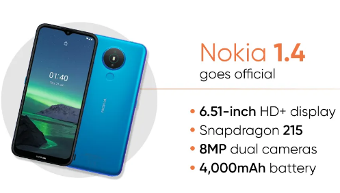 诺基亚1.4配备6.51英寸HD + LCD显示屏,具有1600 x 720像素和20:9的宽高比。它由1.3GHz四核Qualcomm Snapdragon 215移动平台和Adreno 308 GPU配对供电。它有三种型号:1GB / 16GB,1GB / 32GB和3GB RAM和64GB存储空间,可通过microSD卡进一步扩展到128GB。它可以在Android 10(Go版)上运行,但可以升级到Android 11(Go版)。连接功能包括4G VoLTE,Wi-Fi 802.11 b / g / n,蓝牙4.2,GPS和microUSB端口。